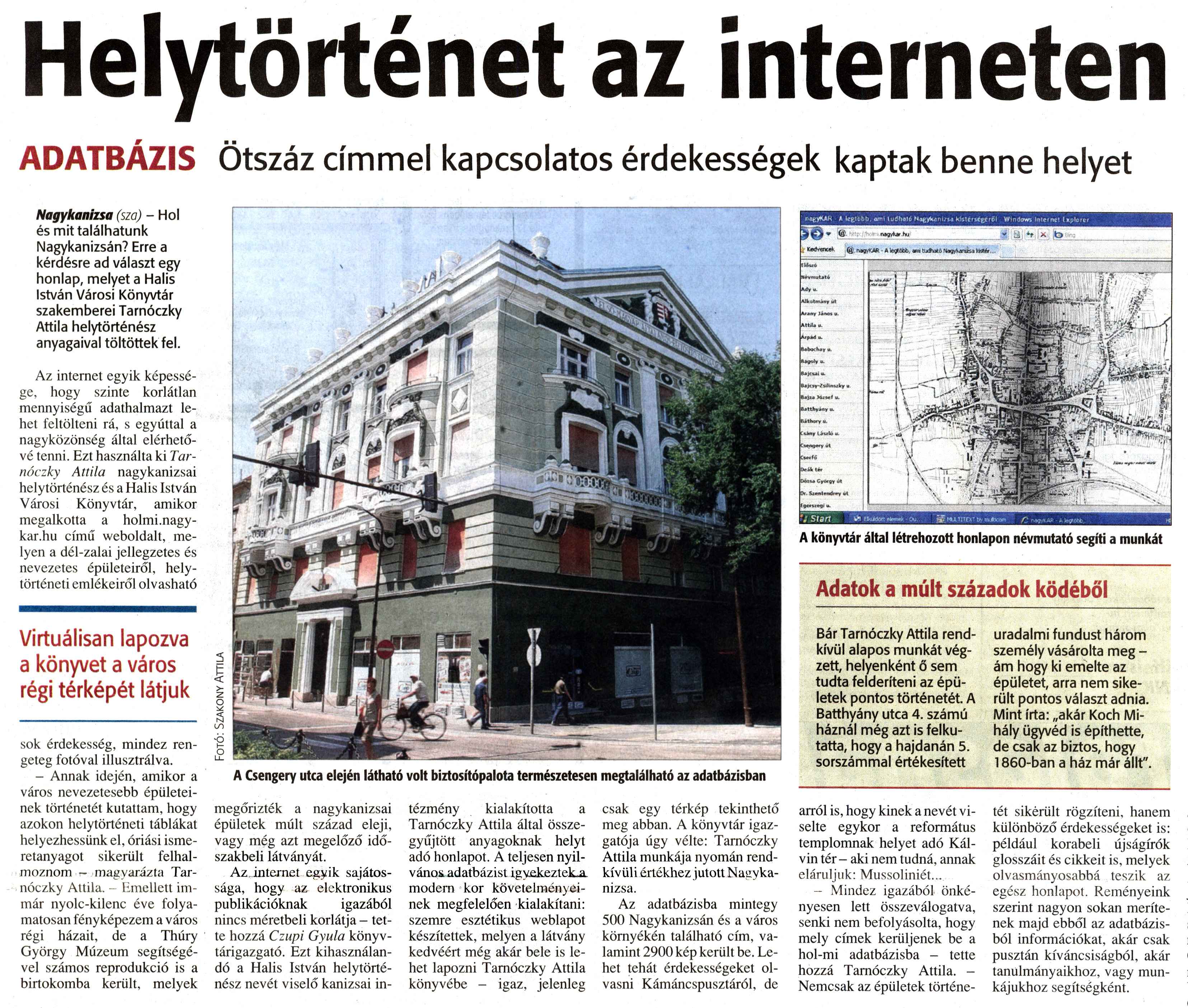 Nyilvános 1873 | 2528 | Zalai Hírlap 2010. július 8. 157. szám 13. oldal - Helytörténet az interneten | A cikk szövege: Helytörténet az interneten ADATBÁZIS Ötszáz címmel kapcsolatos érdekességek kaptak benne helyet Virtuálisan lapozva a könyvet a város régi térképét látjuk Nagykanizsa (sza) - Hol és mit találhatunk Nagykanizsán? Erre a kérdésre ad választ egy honlap, melyet a Halis István Városi Könyvtár szakemberei Tarnóczky Attila helytörténész anyagaival töltöttek fel. Az internet egyik képessége, hogy szinte korlátlan mennyiségű adathalmazt lehet feltölteni rá, s egyúttal a nagyközönség által elérhetővé tenni. Ezt használta ki Tarnóczky Attila nagykanizsai helytörténész és a Halis István Városi Könyvtár, amikor megalkotta a holmi.nagykar.hu című weboldalt, melyen a dél-zalai jellegzetes és nevezetes épületeiről, helytörténeti emlékeiről olvasható sok érdekesség, mindez rengeteg fotóval illusztrálva. - Annak idején, amikor a város nevezetesebb épületeinek történetét kutattam, hogy azokon helytörténeti táblákat helyezhessünk el, óriási ismeretanyagot sikerült felhalmoznom - magyarázta Tarnóczky Attila. - Emellett immár nyolc-kilenc éve folyamatosan fényképezem a város régi házait, de a Thúry György Múzeum segítségével számos reprodukció is a birtokomba került, melyek megőrizték a nagykanizsai épületek múlt század eleji, vagy még azt megelőző időszakbeli látványát. Az internet egyik sajátossága, hogy az elektronikus publikációknak igazából nincs méretbeli korlátja - tette hozzá Czupi Gyula könyvtárigazgató. Ezt kihasználandó a Halis István helytörténész nevét viselő kanizsai intézmény kialakította a Tarnóczky Attila által összegyűjtött anyagoknak helyt adó honlapot. A teljesen nyilvános adatbázist igyekeztek a modern kor követelményeinek megfelelően kialakítani: szemre esztétikus weblapot készítettek, melyen a látvány kedvéért még akár bele is lehet lapozni Tarnóczky Attila könyvébe - igaz, jelenleg csak egy térkép tekinthető meg abban. A könyvtár igazgatója úgy vélte: Tarnóczky Attila munkája nyomán rendkívüli értékhez jutott Nagykanizsa. Az adatbázisba mintegy 500 Nagykanizsán és a város környékén található cím, valamint 2900 kép került be. Lehet tehát érdekességeket olvasni Kámáncspusztáról, de arról is, hogy kinek a nevét viselte egykor a református templomnak helyet adó Kálvin tér - aki nem tudná, annak eláruljuk: Mussoliniét... - Mindez igazából önkényesen lett összeválogatva, senki nem befolyásolta, hogy mely címek kerüljenek be a hol-mi adatbázisba - tette hozzá Tarnóczky Attila. -Nemcsak az épületek történetét sikerült rögzíteni, hanem különböző érdekességeket is: például korabeli újságírók glosszáit és cikkeit is, melyek olvasmányosabbá teszik az egész honlapot. Reményeink szerint nagyon sokan merítenek majd ebből az adatbázisból információkat, akár csak pusztán kíváncsiságból, akár tanulmányaikhoz, vagy munkájukhoz segítségként. Adatok a múlt századok ködéből Bár Tarnóczky Attila rendkívül alapos munkát végzett, helyenként ő sem tudta felderíteni az épületek pontos történetét. A Batthyány utca 4. számú háznál még azt is felkutatta, hogy a hajdanán 5. sorszámmal értékesített uradalmi fundust három személy vásárolta meg -ám hogy ki emelte az épületet, arra nem sikerült pontos választ adnia. Mint írta: „akár Koch Mihály ügyvéd is építhette, de csak az biztos, hogy 1860-ban a ház már állt". A Csengery utca eleién látható volt biztosítópalota természetesen megtalálható az adatbázisban A könyvtár által létrehozott honlapon névmutató segíti a munkát Fotó: Szakony Attila |
