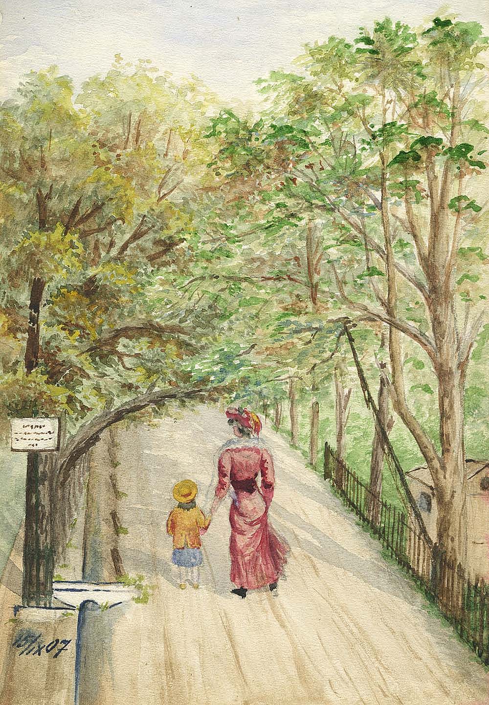 (Az Ady utca sorompón túli része a fasorral Steiner Edgár 1907-es vízfestményén. Az út fölé hajló, öregedő akácok egyre több gondot okoztak.)