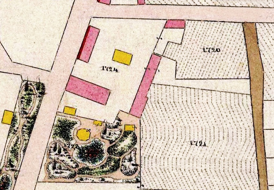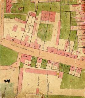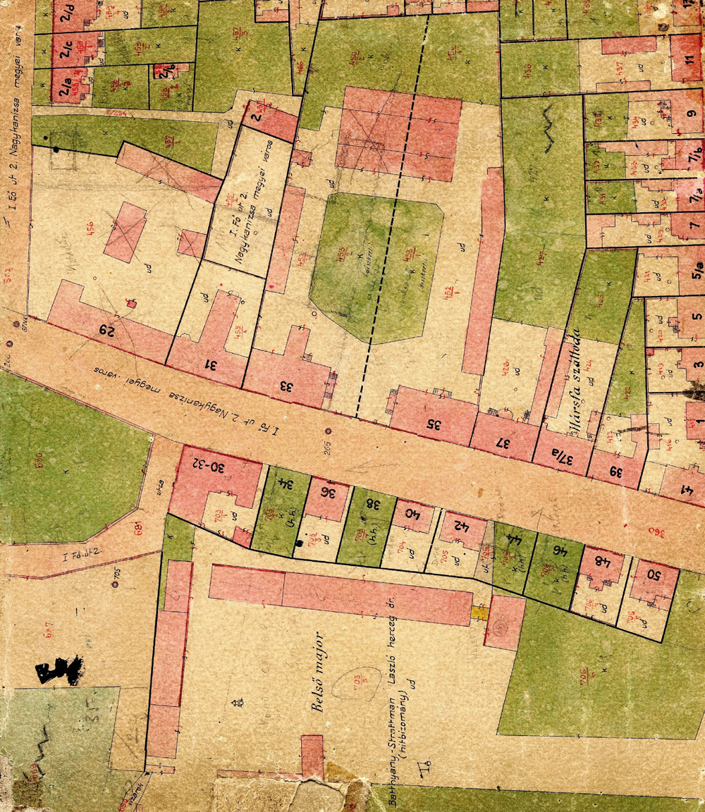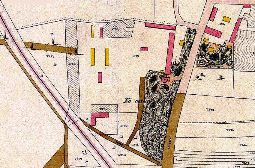 (Középen, fent a mai Ady utca és folytatása, a légrádi országút. Attól balra, barnával a Práter erdői.)