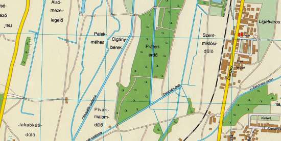 •Szemben a vasútállomással szemben találjuk azt a Principális-csatornáig terjedő és a déli irányban elnyúló térséget, amely rétjeivel, legelőivel, ligetes erdői terebélyes fáival elődeink kedves kirándulóhelyének számított. „Prater” volt a neve, az uradalom birtokolta, de a város lakóinak engedélyezték látogatását. Elnevezéséhez talán a bécsi Prater adta az ötletet.