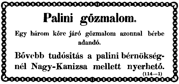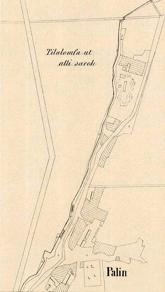 •A kastélytól némileg délre állt a palini uradalom „hat kerékre felállított” (időnként lazsnakiként emlegetett) gőzmalma, az 1862-ig létező „uradalmi gyár” része. A malom helyét a második katonai felmérés (1858) még nem jelezte.