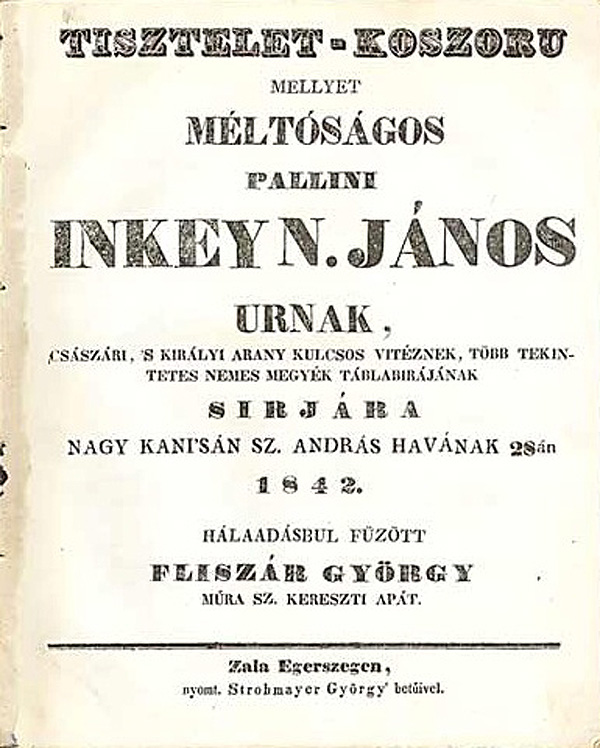 Inkey János Zala, Somogy és Vas alispánja volt. Kastélya így a három megye vezetőinek, befolyásos embereinek találkahelye volt a megyeházák megépültéig.