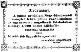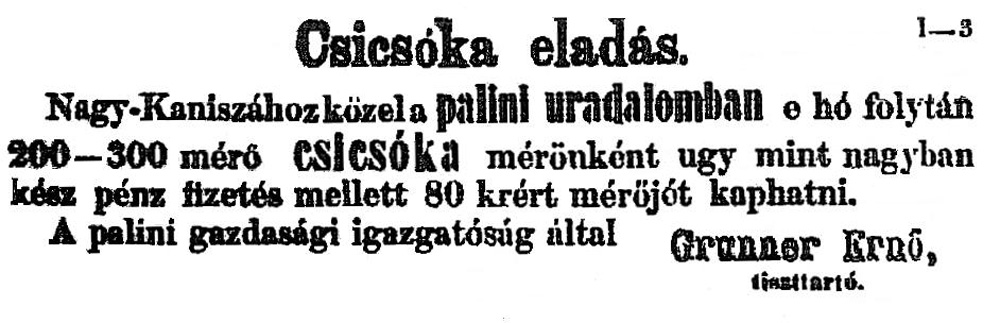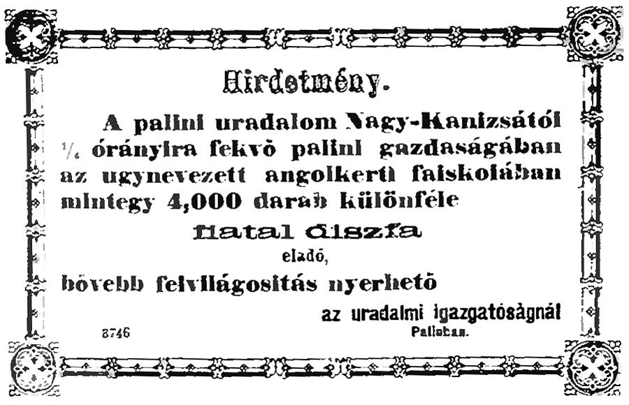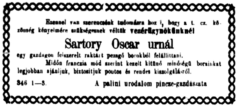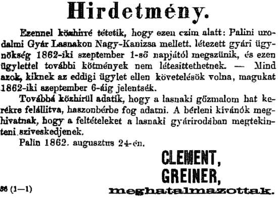 •A palini központi rész bérlője a tulajdonos összes uradalma főigazgatójának fia, a francia származású Clement Lipót lett. Clement egy év alatt megtanult magyarul, a kastélyt pezsgőgyárrá, az angolparkot legelővé, faiskolává alakíttatta. Feleségül az uradalmi számtartó, Godina János (1894-ben, hetvennégy évesen érte a halál) leányát, Vilmát választotta. Ötvenhárom éves volt, amikor 1902-ben meghalt.