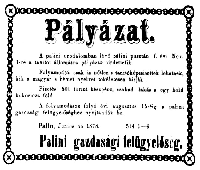 •Itt kezdte működését az 1952/53-as tanévben megszervezett palini óvoda is. Két esztendő múlva az Inkey-kastélyba költöztették az intézményt.
