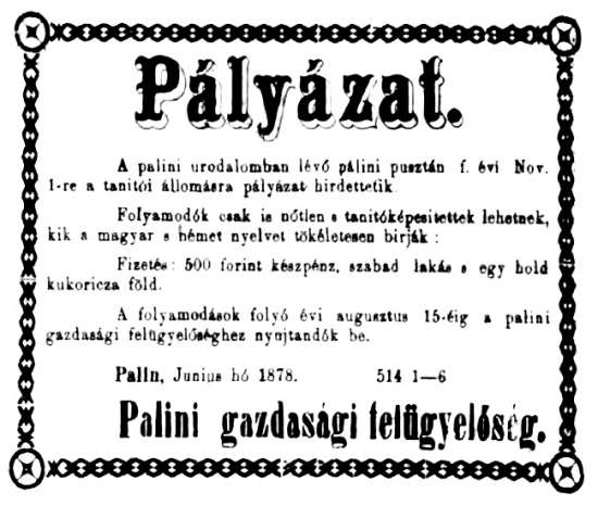 Az egy tanerős palini iskola 1868-tól folyamatosan működött. Az intézménybe sokáig főleg az uradalmi cselédek gyermekei jártak.
