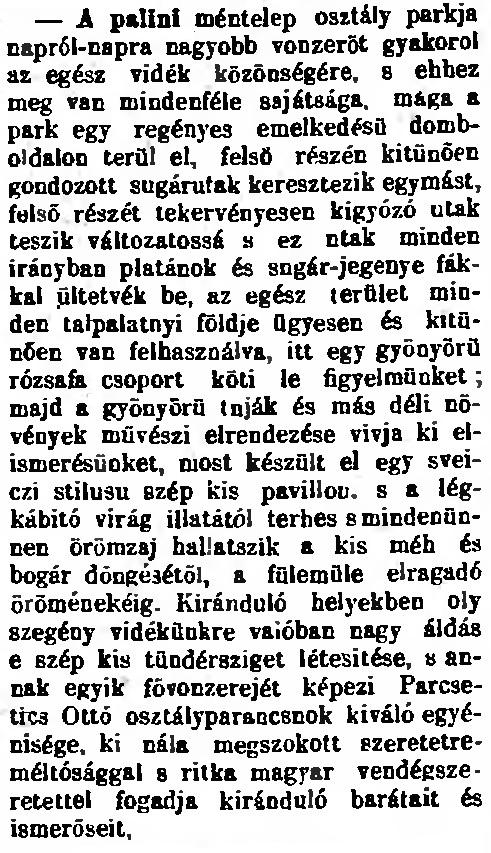 (A területen kialakított fiatal park legszebb része a korábbról származó vadgesztenyés volt. Egyértelműen Parcsetich érdeme volt viszont, hogy az ökrök és birkák tanyája helyén szemet gyönyörködtető kert létesült. Felettesei egy 1893-as napiparancsban − elismerve a parancsnok érdemeit − az Ottó-park nevet adták a helynek.