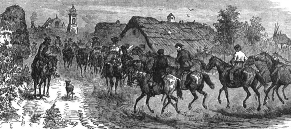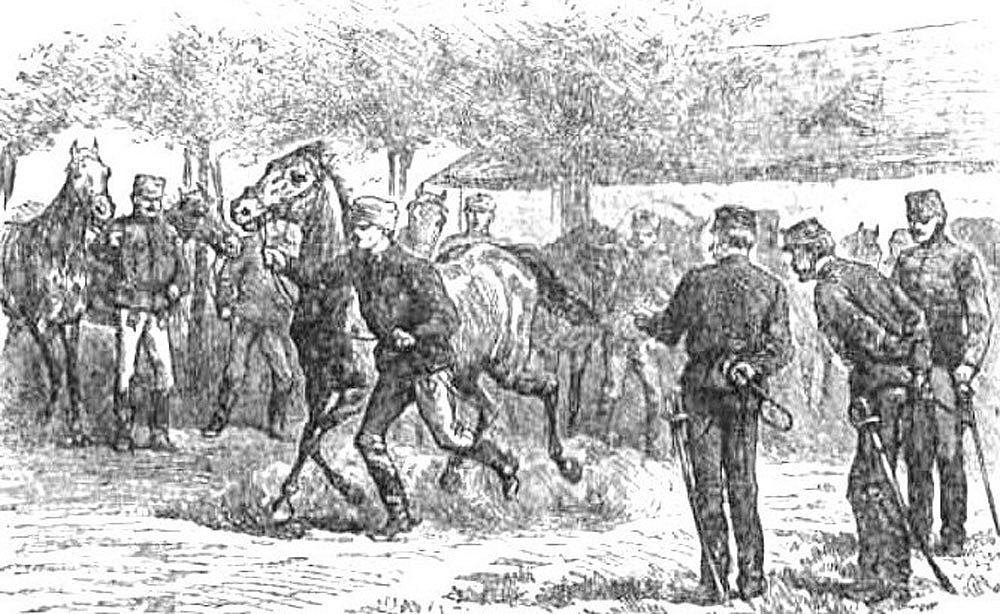 A katonaság számára felvásárolt lovak hajtása a kereskedőhöz (1881)