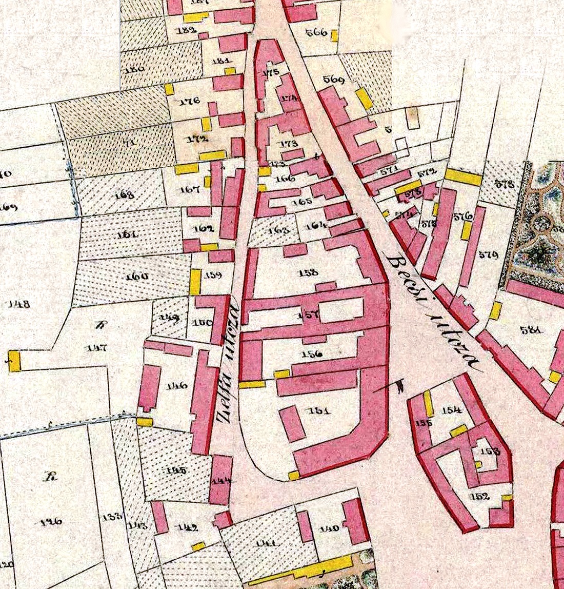 •Az utca keleti oldalának telkei eredetileg mind a Magyar utcáig (Erzsébet térig) nyúltak.