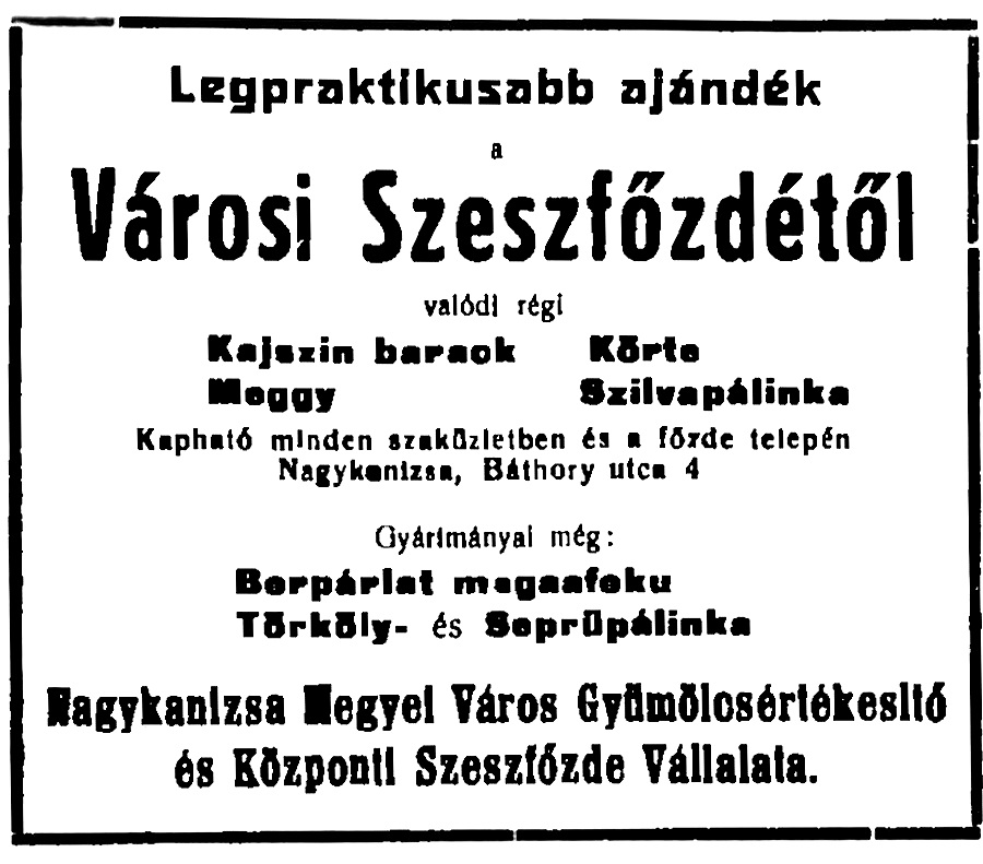 1918-ban ezekben nyílt meg Nagykanizsa Város Gyümölcsértékesítő és Központi Szeszfőzde Vállalata.