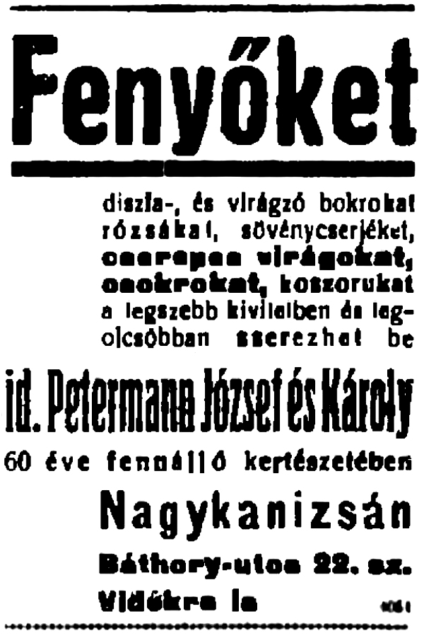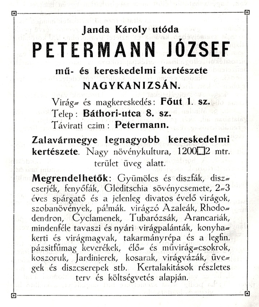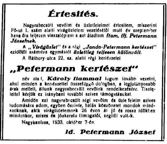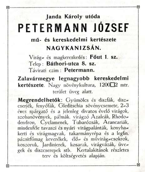 1913-as halálával utódja veje, Petermann József (1874-1955) lett. Ő 1911-ben az utca 8. számán hirdette vállalkozását.