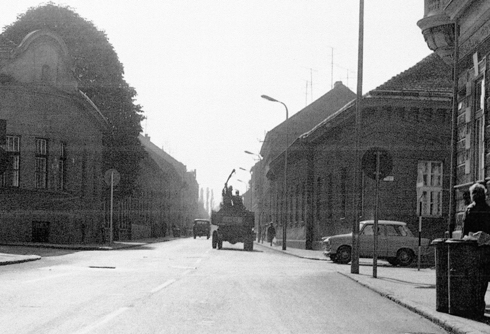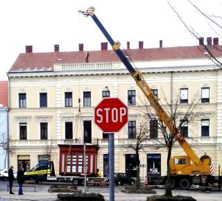 (A város utolsó újságos bódéjának elszállítása Czupi Gyula 2015 februárjában készített felvételén.)