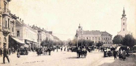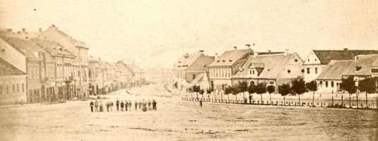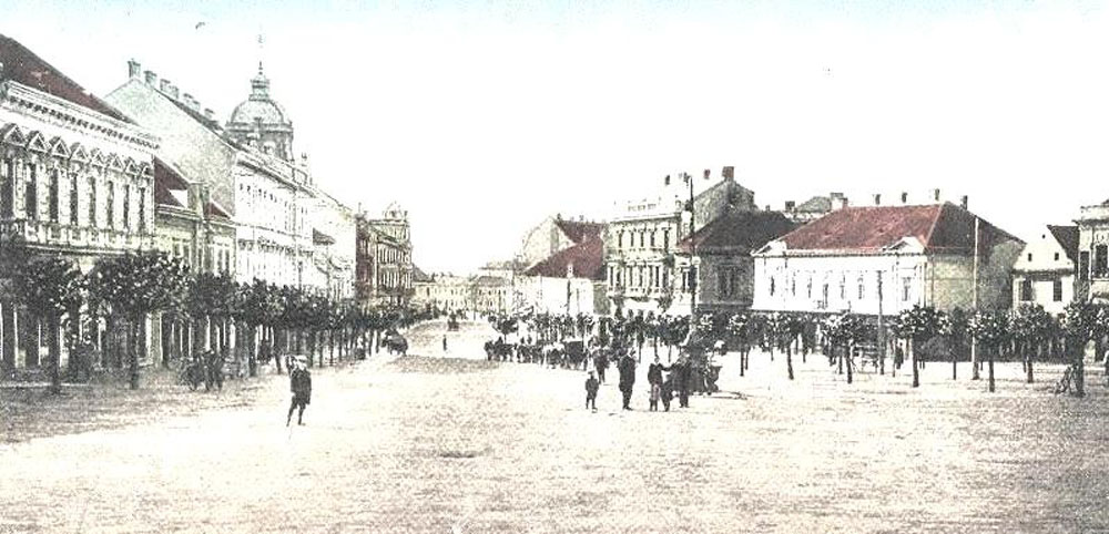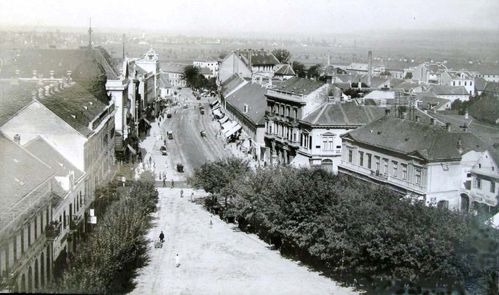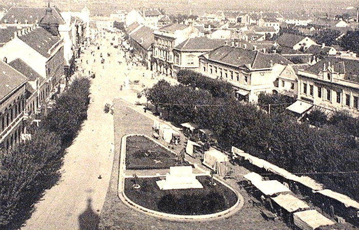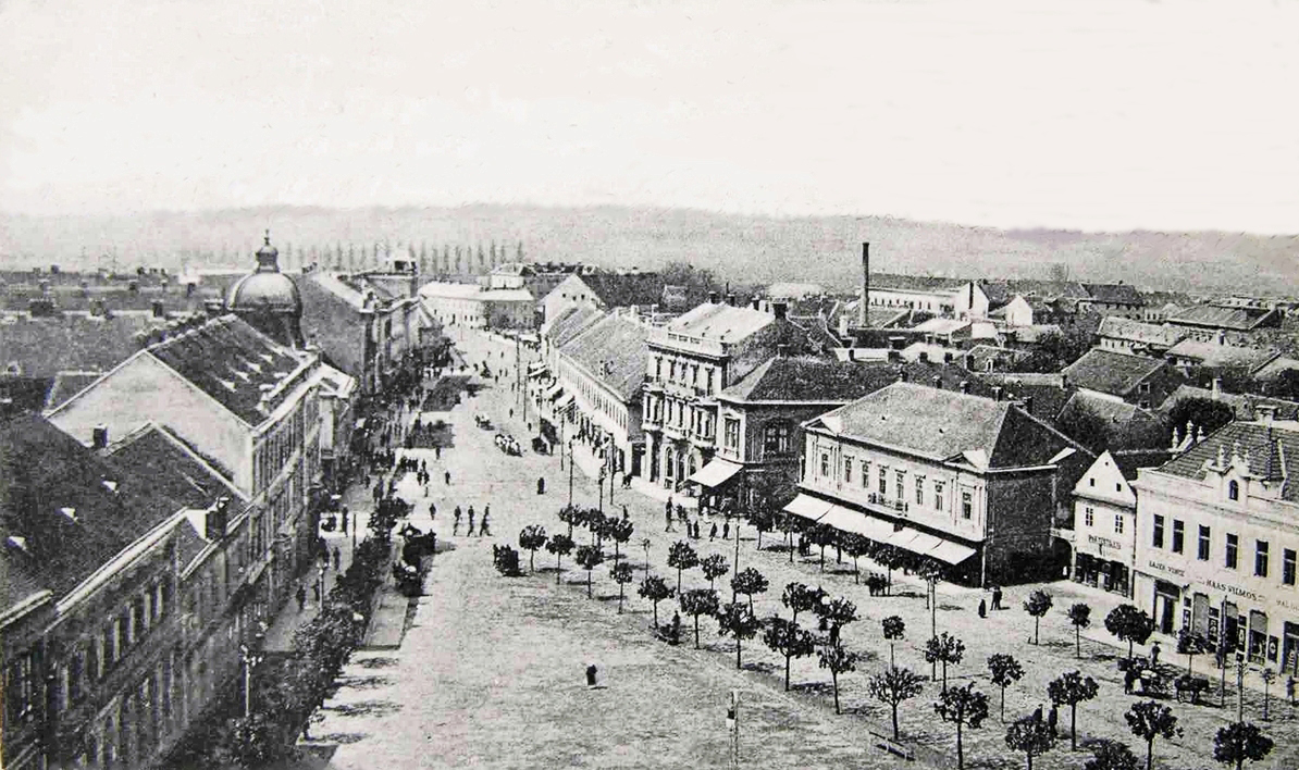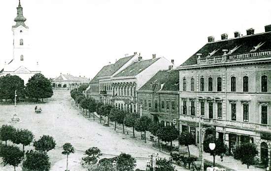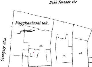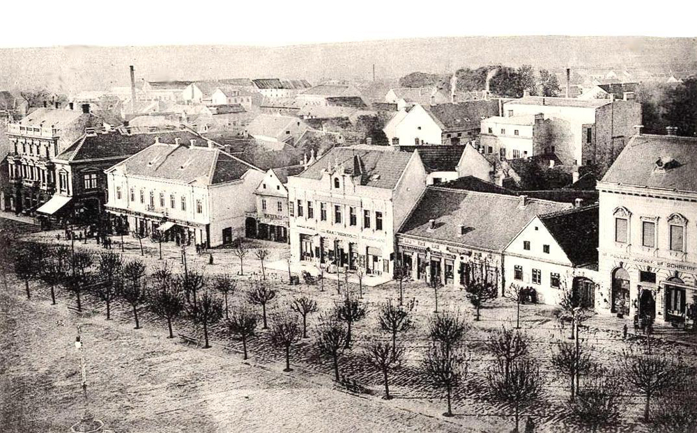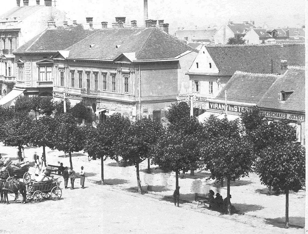(Balról a Deák tér 3. szám alatti épület, még földszintes formájában. Mögötte a Grünhut-ház, a Wlassics-ház és a takarékpénztári palota eredeti változata. Jobbról részben látszik a két Vagner-ház a Deák tér 11. és 12. alatt. Mögötte a Bajer-ház földszintes elődje, az oromfalával az utcára néző Czenek-ház, a még földszintes, de magas tetőterű Lovák-ház. Ennek szomszédságában, a Sugár utca torkolata helyén látható a régi, de már emeletes Babochay-ház, mellette a Weiser-ház telkén két jelentéktelen, apró házikó.)