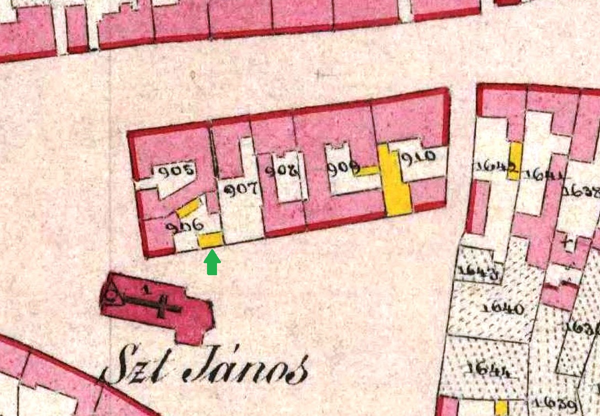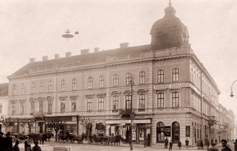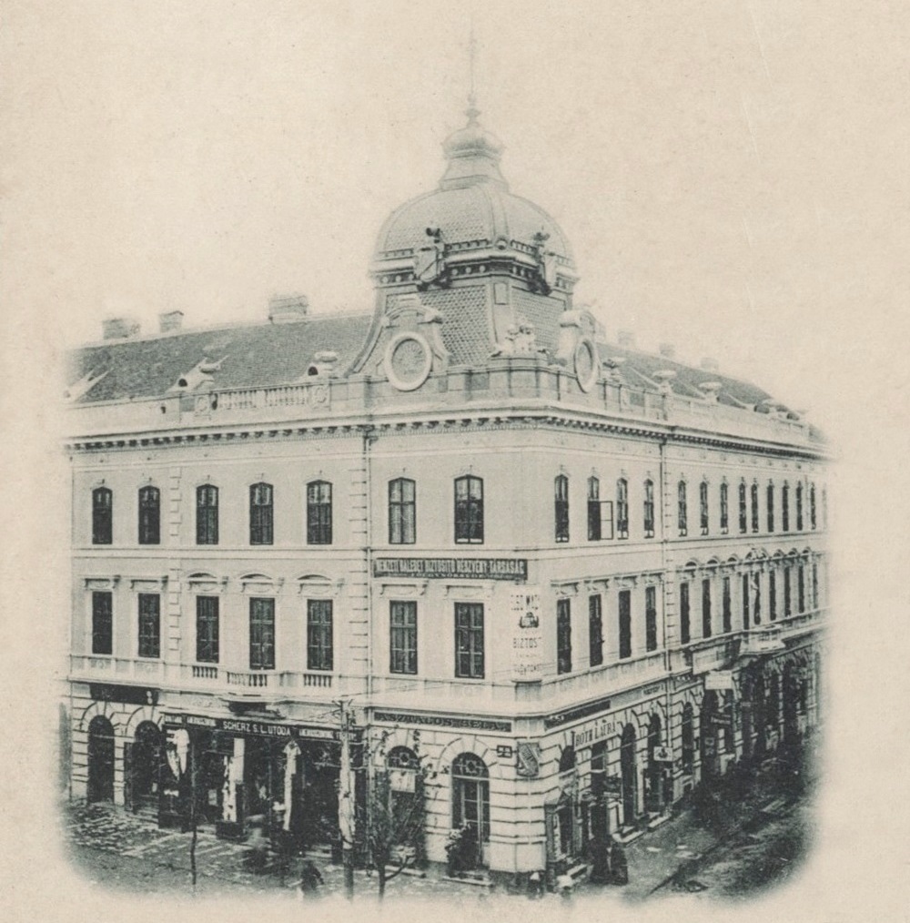 •A jelenlegi épület elődje a két részből álló (valószínűleg két ütemben is épült), kis, földszintes sarokház Haas Vilmos kereskedő, szállodás tulajdonában volt a századfordulón.
