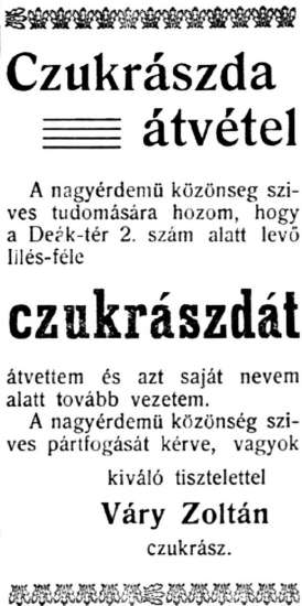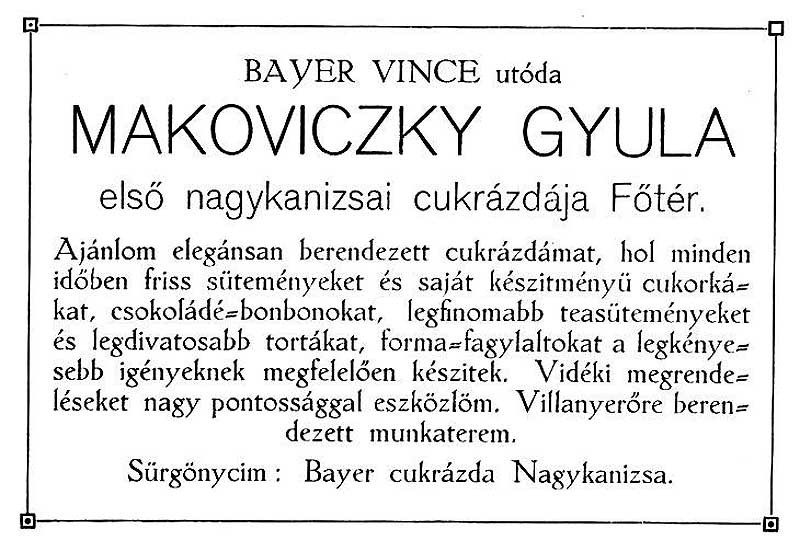 A vállalkozást 1910 végén (előtte egy évig a cukrászda bérlője volt) Makoviczky Gyula (1883-1951) vette át. A mester híre messzire eljutott. Puncstortája különösen népszerű volt, flótniját Bécsben is kedvelték.
