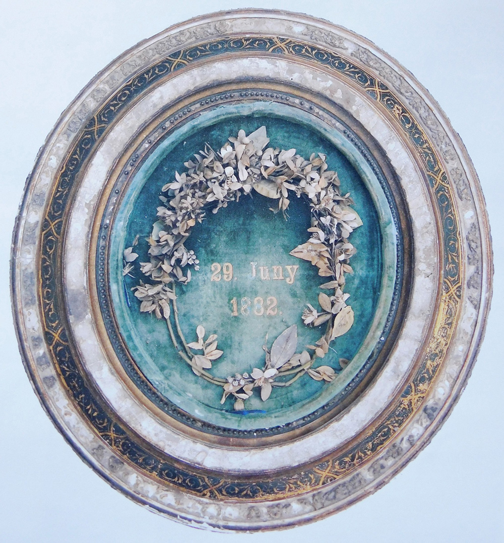 Az ismételt megtekintés sem segített, csak a teleobjektíves fényképezés. Valóban… A talapzat mindig árnyas, északi oldalán megtaláltam a nevet, de egy dátumot is: 1900.