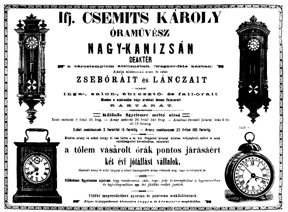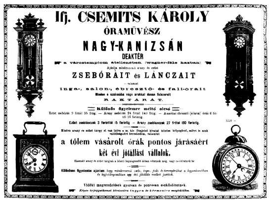 Egy hirdetés 1888-ból és Csemits (Csemics) egyik órája