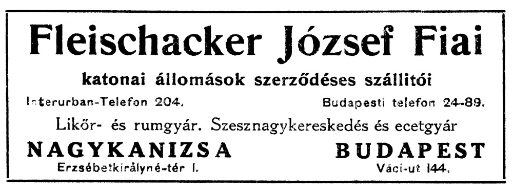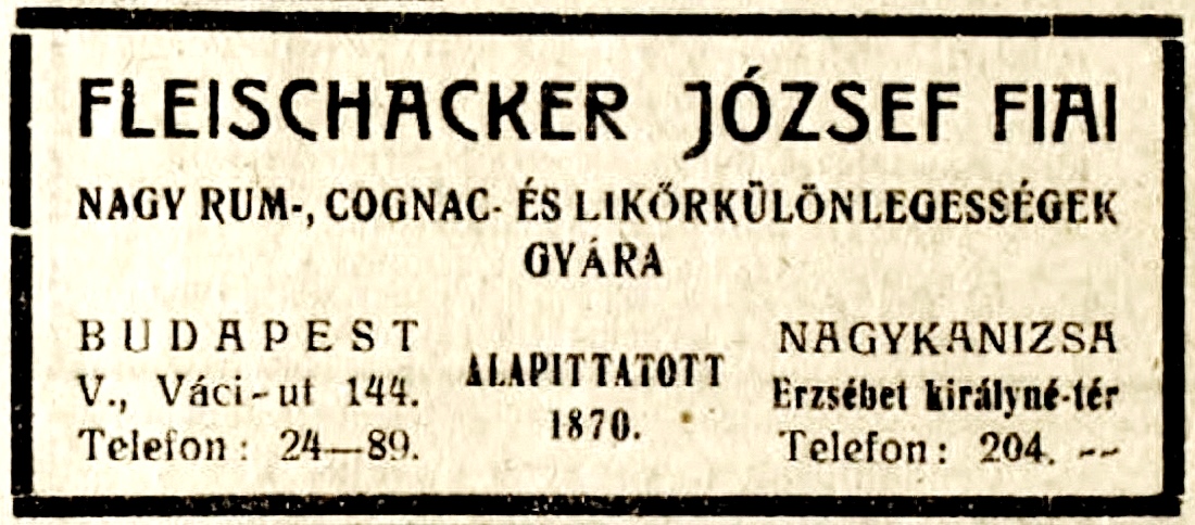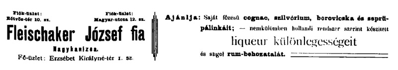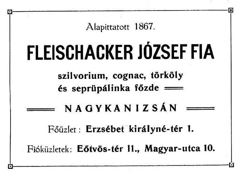 A népes (nevét részben magyarosító) család egyik ága az 1900-as évek elején a Fleischacker József Fiai szesznagykereskedő céget működtette. Főzdéjük is volt az Erzsébet tér 1. szám alatt.
