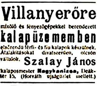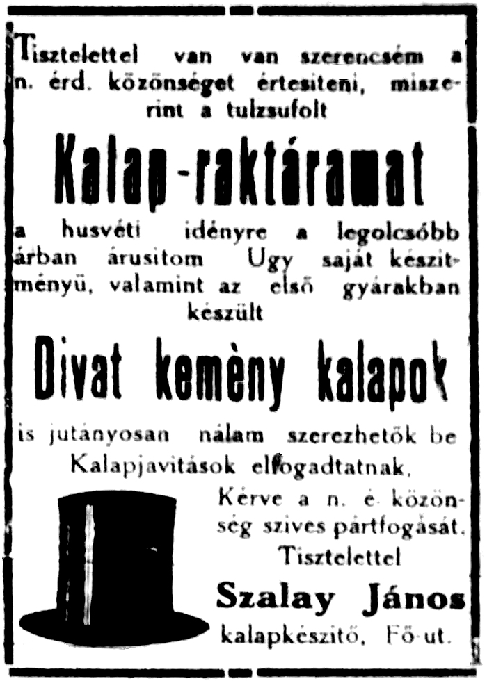 Szalai János, 1869-ben született kalapos 1914-es és 1933-as hirdetése és 1930 körül készült fényképe