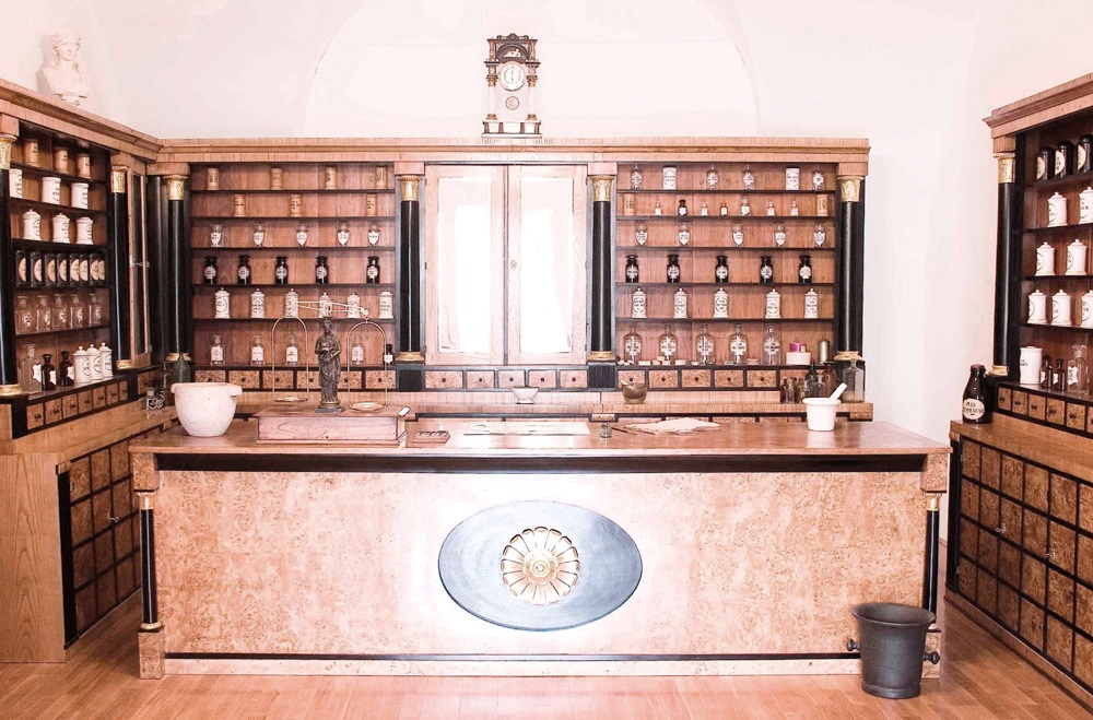 A patika helyreállított berendezése a múzeumban