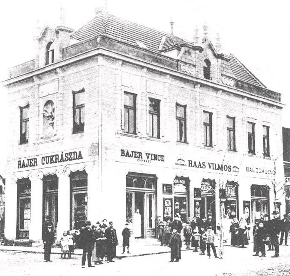 •A mai ház Bajer Vince cukrász lakóháza volt, aki 1946-ban, nyolcvanegy esztendős korában hunyt el. 1903-ban, Haas ingatlanjának megvásárlása után építtette, szecessziós stílusban. Sallér Lajos tervezte és kivitelezte.