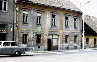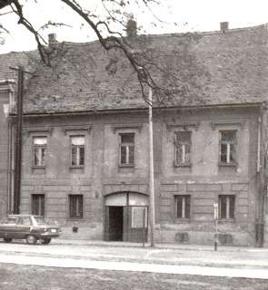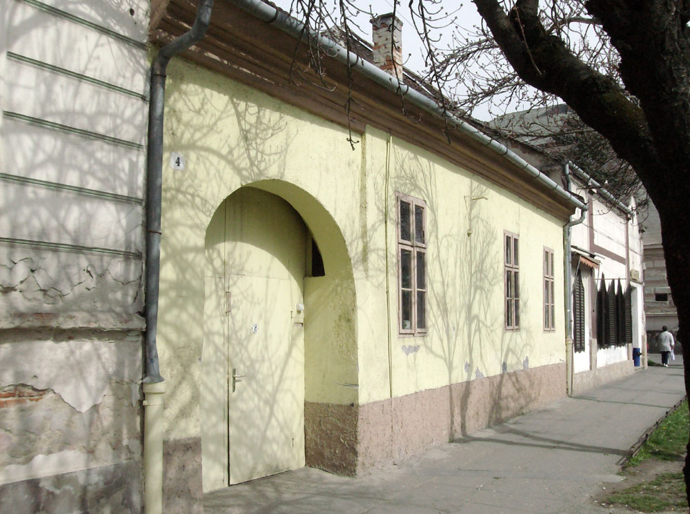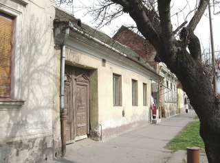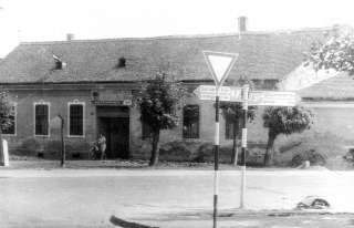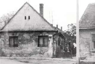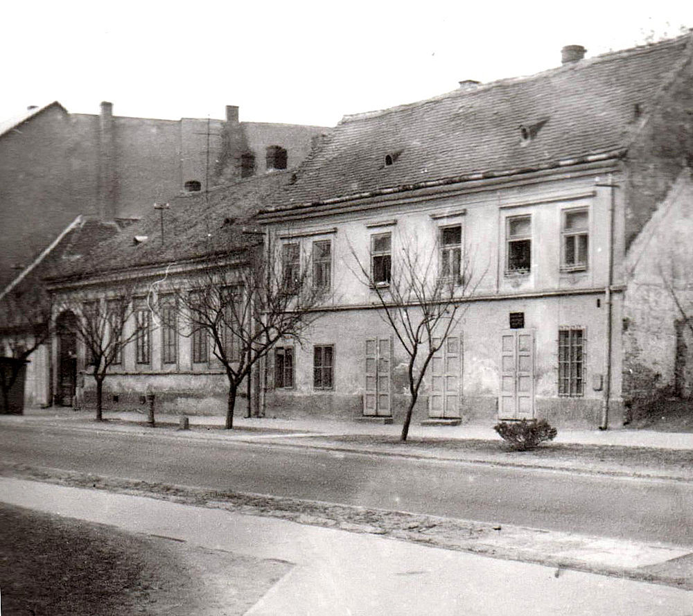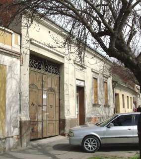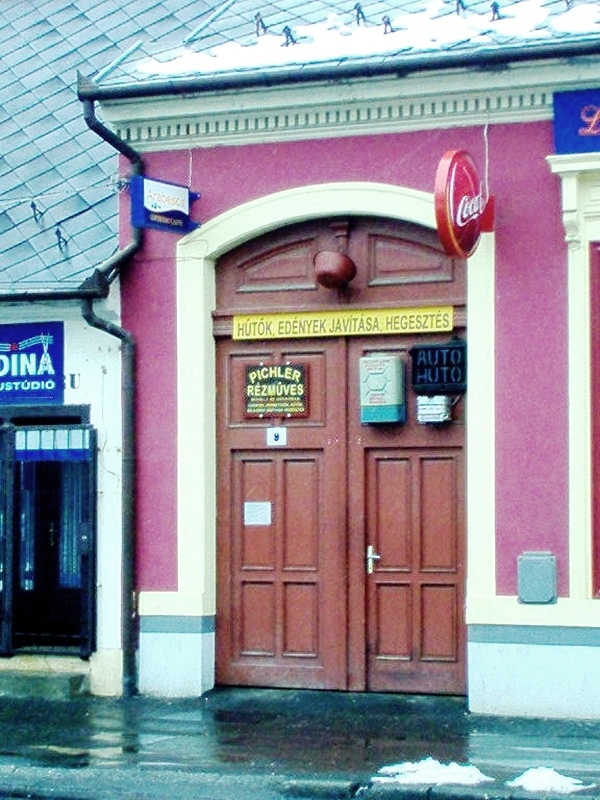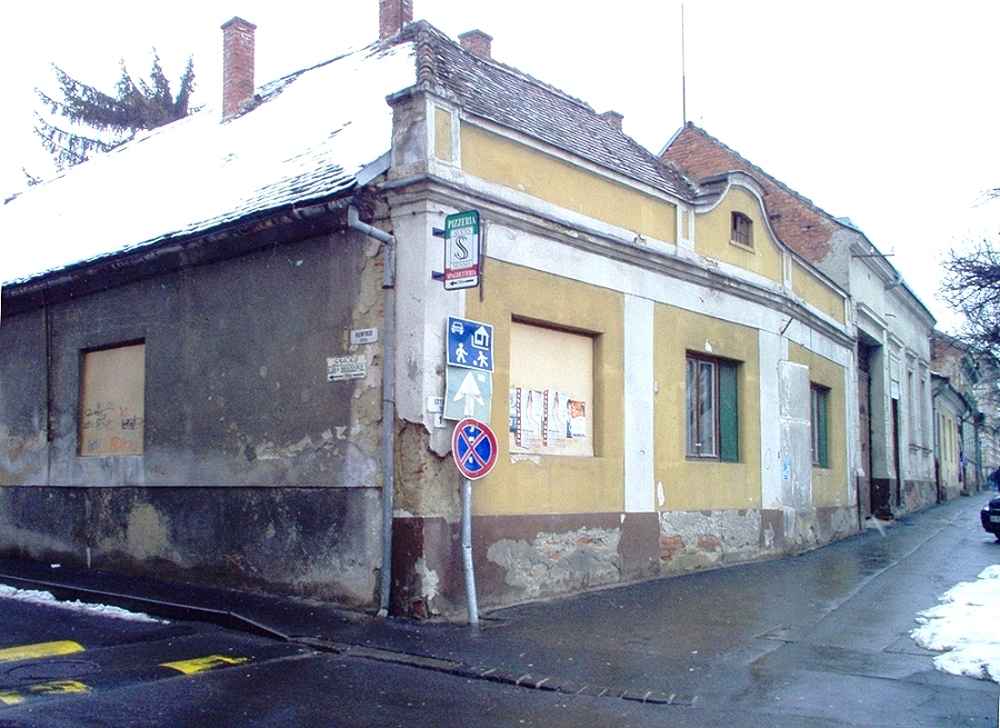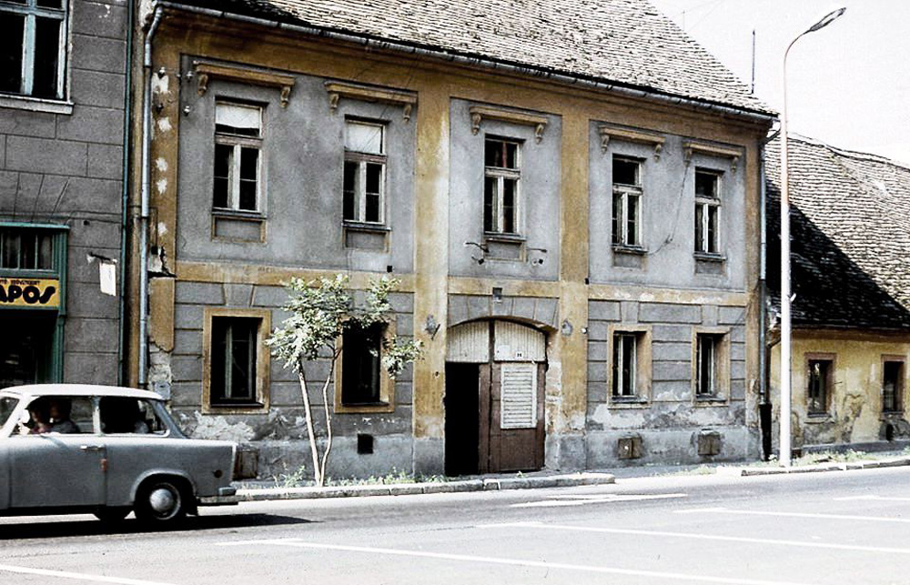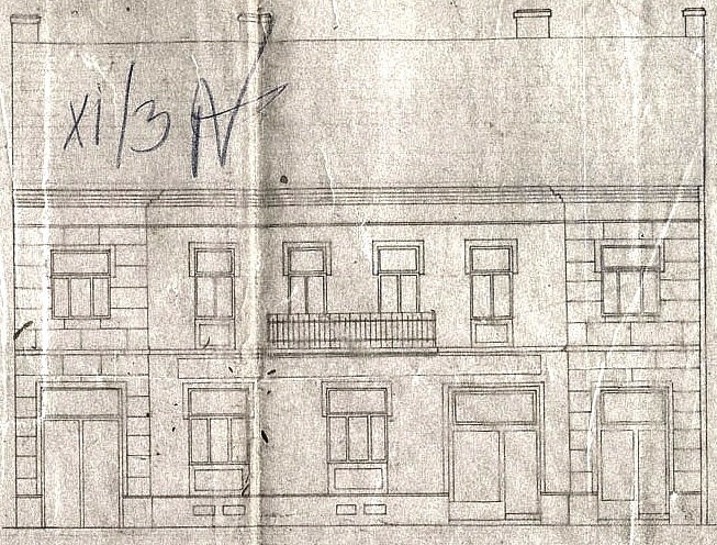 (Az utcai homlokzat közepén a hajdani Kudlik-féle műhely bejárata.)