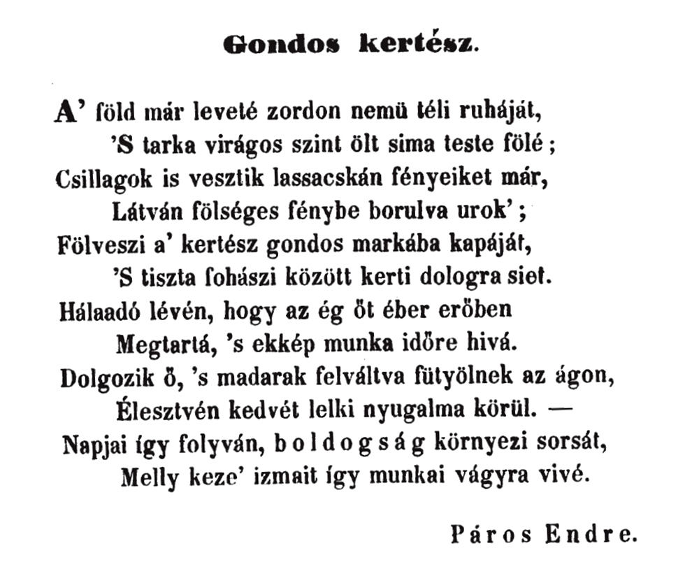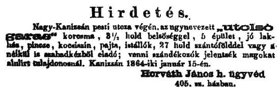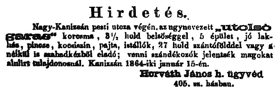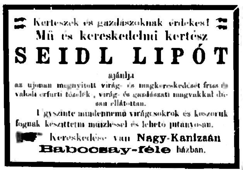 (Szeitl kertész tanár, a hirdető Seidl Lipót kertész és az első városi kertész, Szeidl Lipót, az eltérően írt nevek ellenére, ugyanazon személy. Szeidl Lipót kertészete valahol az Óriás − ma Kinizsi − utcában volt. 1891-ben, hetven évesen halt meg.)