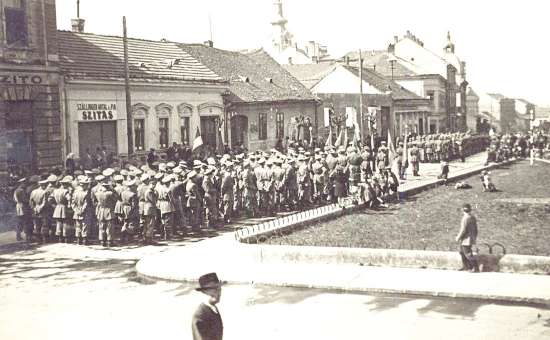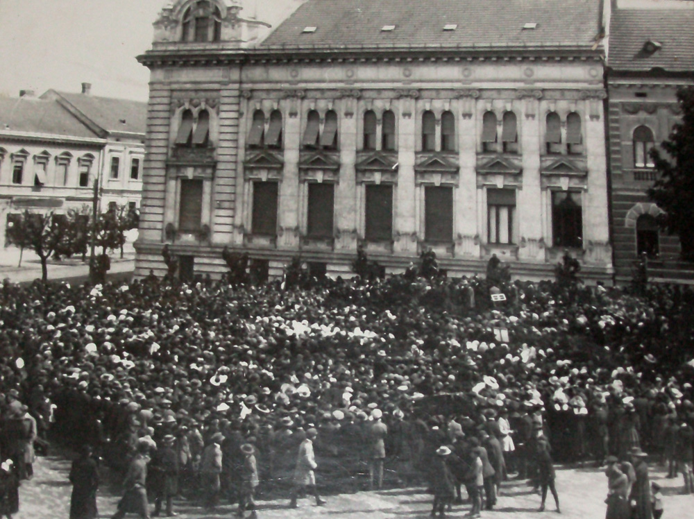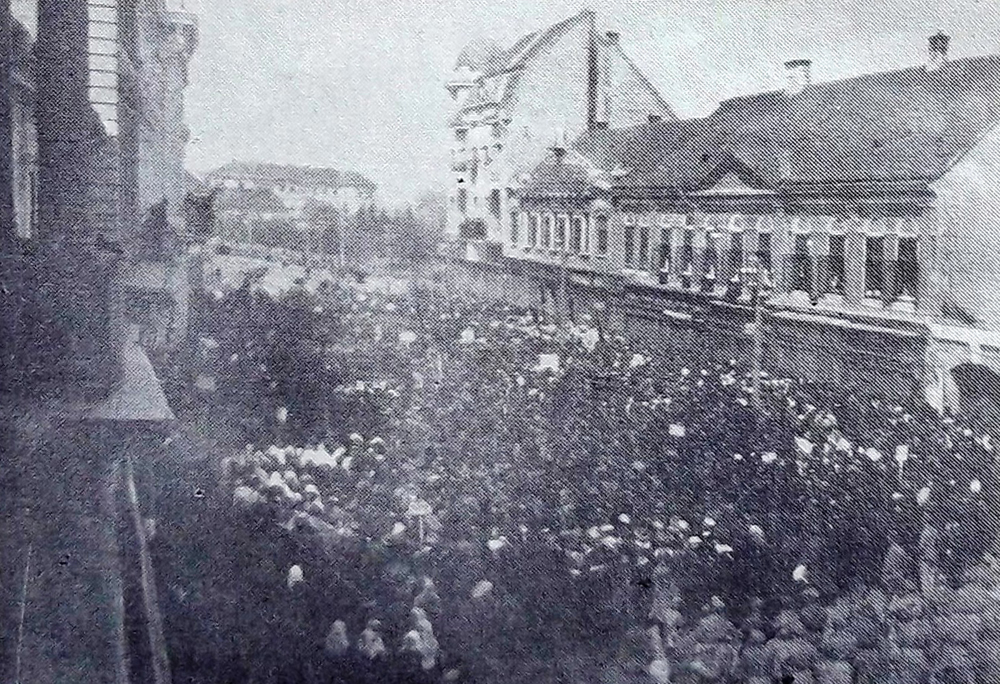 (Az Erzsébet térről induló négy cigányzenekar gyűjtötte össze az ünneplőket város külső részeiből. Visszaérkezve, a tömeg elindult a városháza elé, a nagygyűlés helyszínére. Ehhez nem a természetesnek tűnő – Erzsébet tér sarka - városháza sarka – útvonalat választották, hanem ellátogatták a Rozgonyi, a Sugár, a Csengery, a Szemere és az Ady utcákba is.