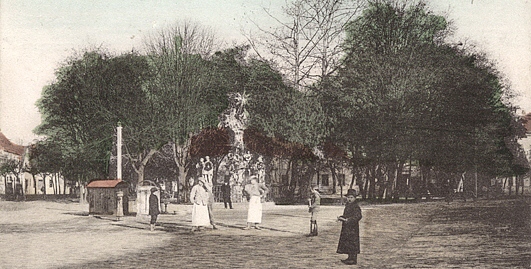 (Alul, a szoborcsoporttól balra a közkút felszíni részei láthatók.)