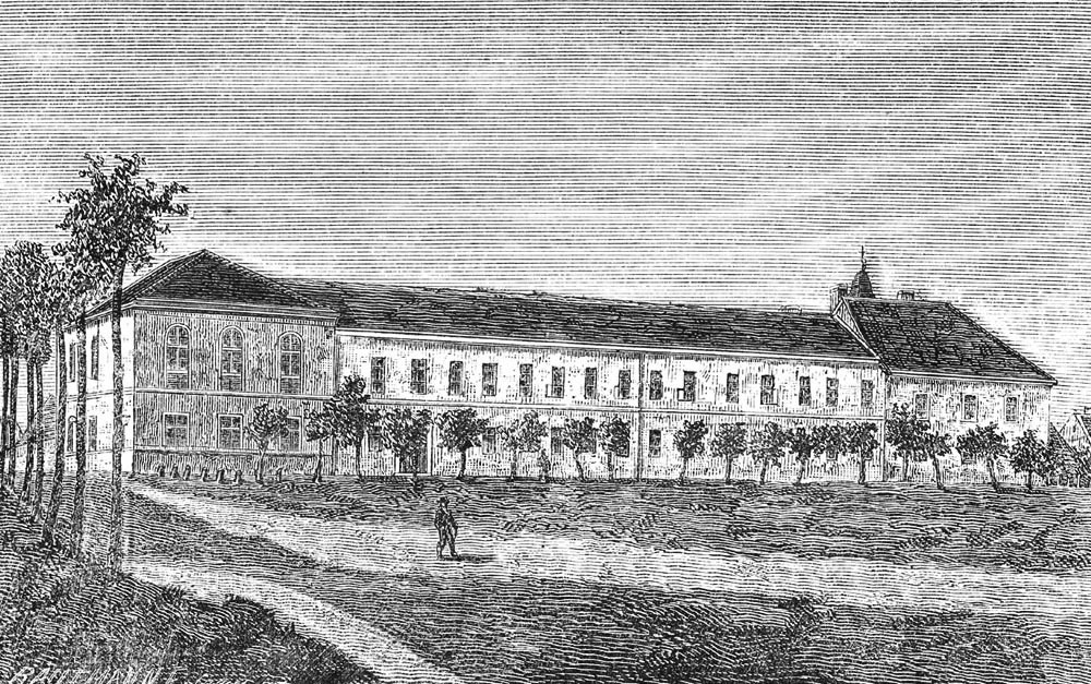 „Iskola-épületünk olyan nyomorúságos állapotban van, hogy esős idő alkalmával, ha megázni nem akar az ifjúság, egyik szögletből a másikba kell húzódnia; a szónoklati osztály növendékeit már néhányszor fel kellett menteni a tanítási óráktól, mert az ablakhoz támasztott dobogó sem volt elegendő a szél által kavart hó és havas eső beverésének meggátlására. Az iskolai szűk termek mennyezetéről a vakolat nagy részben lemállott, mert a hébe-hóba nagyjából foltozgatott tető mindenütt átereszti az esőt és a hólevet; de maguk a tantermek falai is visszataszító látványt nyújtanak. Az épület utca felőli oldala teljesen vakolatlan, belül a szónoklati osztály előtt a folyosó leszakadozott; némely osztály talaján kilátszik a csupasz föld s a falak régtől fogva nem voltak meszelve.
