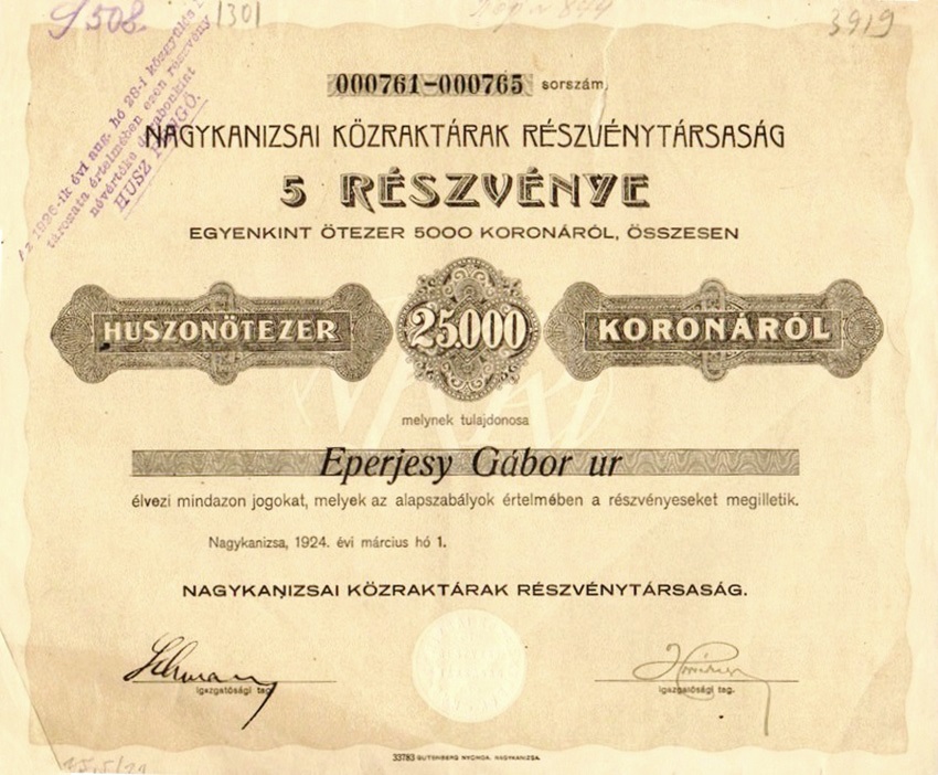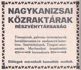 •Két évtizednyi sikertelen próbálkozás után 1898-ban a Nagykanizsai Kereskedők Társulata szervezésében végre rendeződni kezdett a városban a gabonakereskedelem számára régóta hiányzó tárházak létesítésének ügye: megalakult a Nagykanizsai Tárházak Rt.