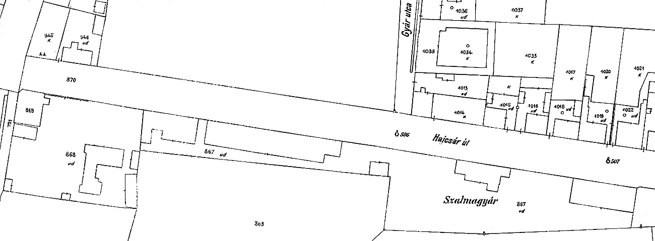 Ezt követően, 1892-ben az utca déli oldala mentén húzódó, keskeny, hosszú területen épült meg a „szalmagyár”. Előbb a Babochay (Gyár) utcától nyugatra eső rész készült el. Bettlheim Győző és Ede – Samu fiai – emeltették Sallér Lajos tervei szerint. Az építmények (két üzemi egység és egy szín a nyersanyag tárolására) kivitelezője valószínűleg maga a tervező volt.