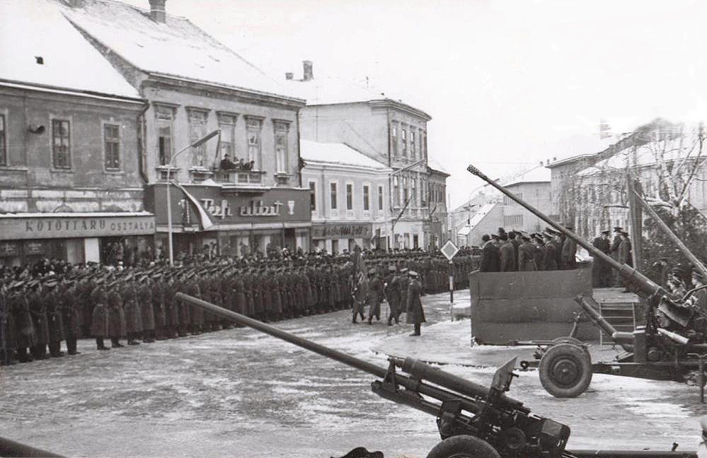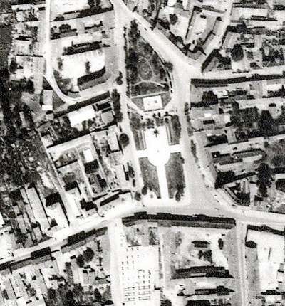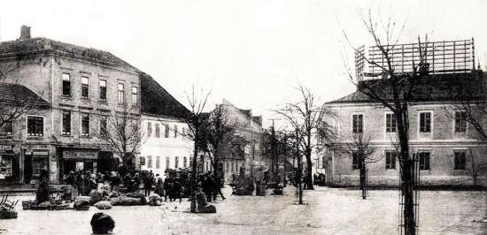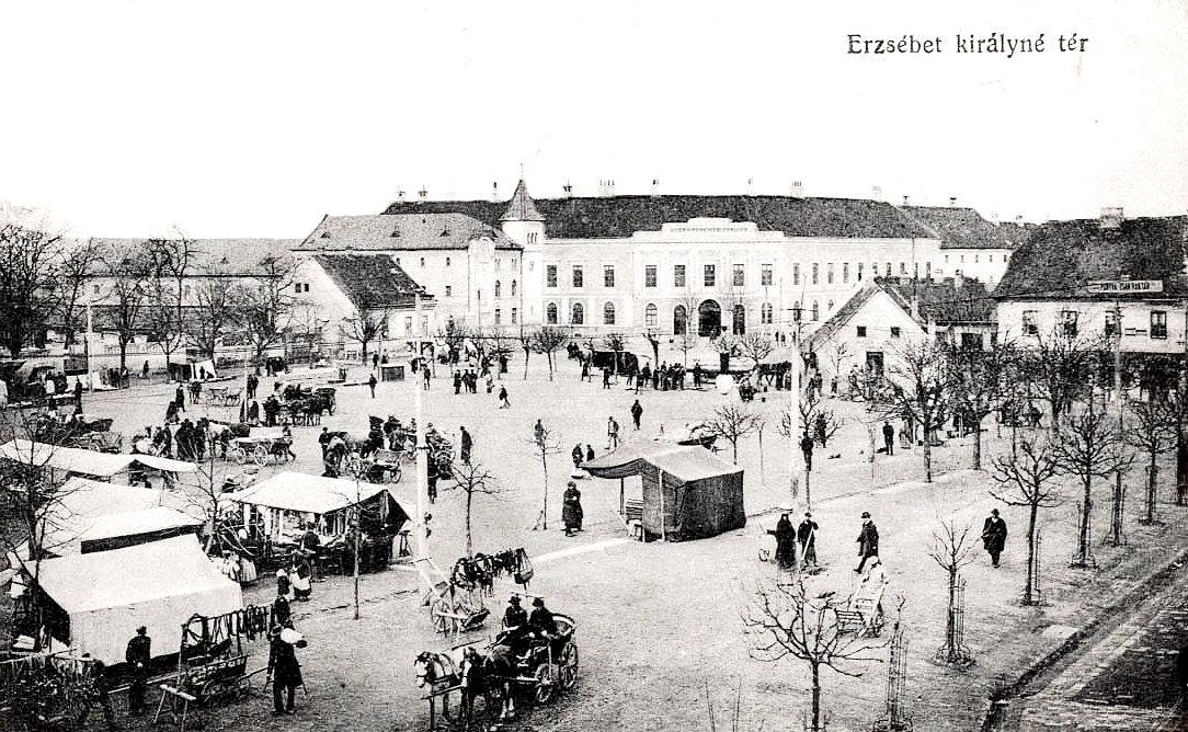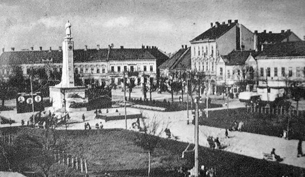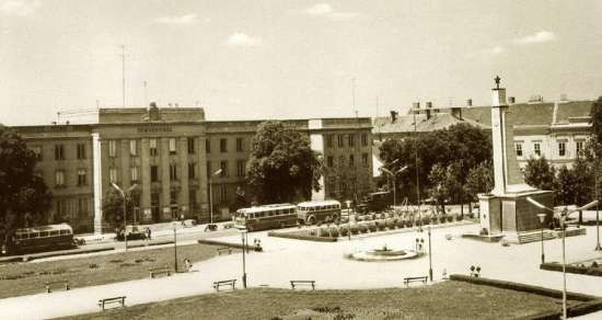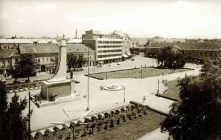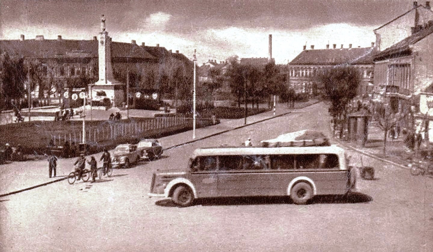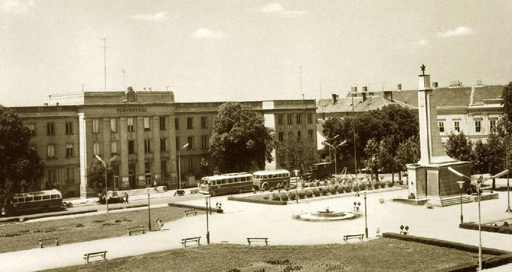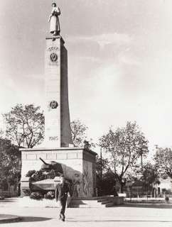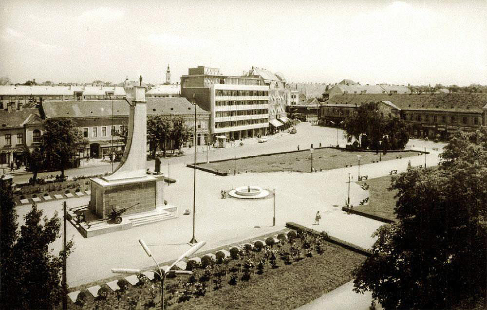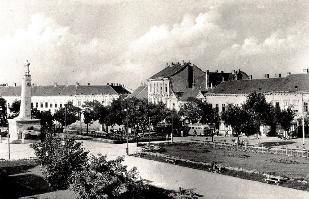 •Mint a következő képeken látható, az 1945-ben épített szovjet emlékmű teljesen megváltoztatta a tér funkcióját. A városi piacnak költöznie kellett, 1947-ben már a Zárda utcában találta meg az eladni vagy venni szándékozó.