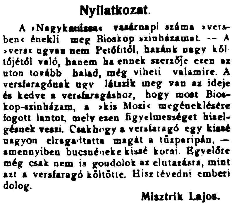 A „Zala" következő, 1911-es versikéjében azonban az újságíró az általános drágulásra panaszkodik. Panaszáradat ide vagy oda, a szerző nem vesztette el teljesen humorérzékét... Még nem.