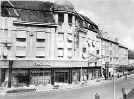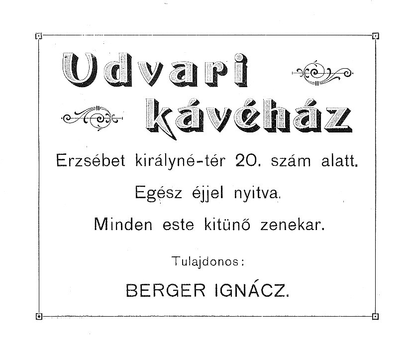 •Az épület földszinjén alakították ki Kardos József és Steiner József kávéházát. A 25 méter széles, 38 méter mély helyiségben 70 asztal, 240 szék, 70 karosszék várta a vendégeket.