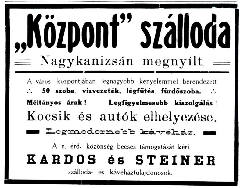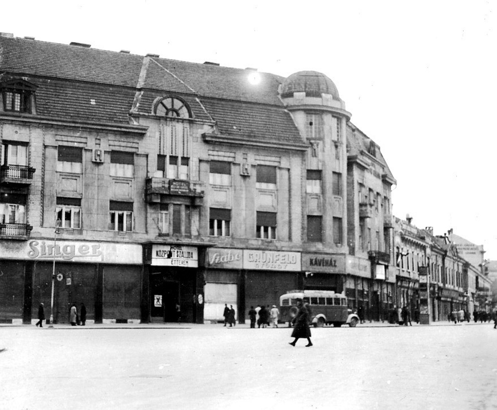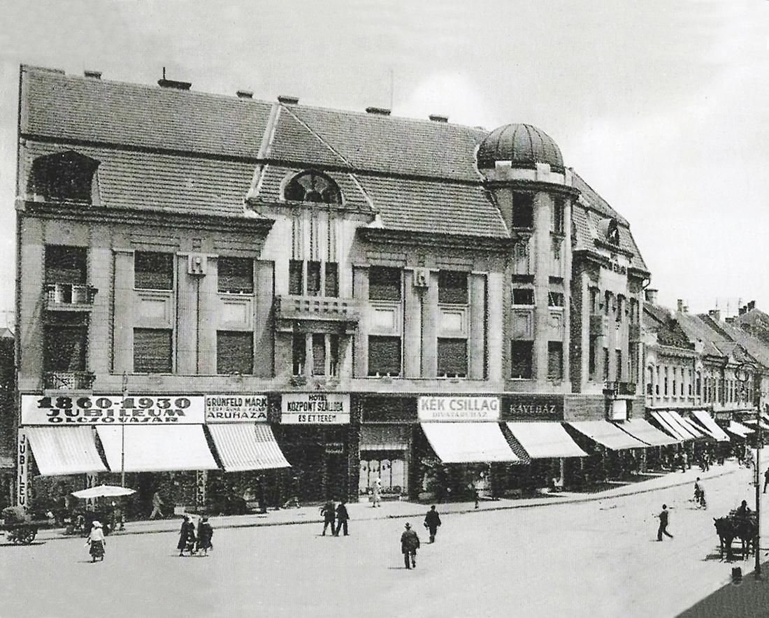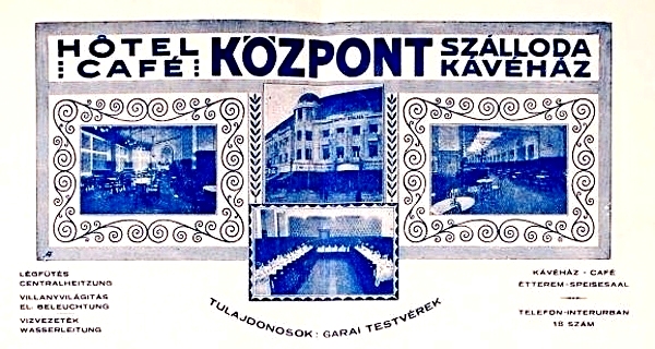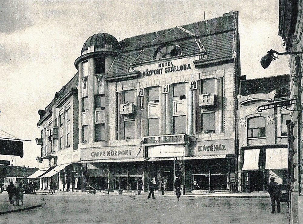 •Az 1911-ben megvásárolt bérházak helyére Zerkowitz Lajos bornagykereskedő vezetésével egy konzorcium 1912–13-ban építtette fel ifj. Gyenes Lajos és Vajda Andor budapesti építészek tervei alapján a Központ (Centrál) szállót, kávéházat, éttermet és bérpalotát. Az építkezés kivitelezője Müller Ede cége volt Szombathelyről. A Gyenes és Vajda tervezte bútorzatot Lengyel Lőrinc szegedi üzeme készítette.
