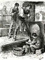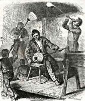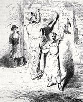 (Leköpi a rendőr cipőjét, a szomszéd kofa kalarábiját, egy kutya fejét, egy kontyos nagyságát, míg aztán egy pajkos tanonc kirántja alóla a köcsögöt és elszalad vele; a kofa hanyatt vágódik s elterül a földön.): No még csak ez hiányzott!...