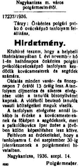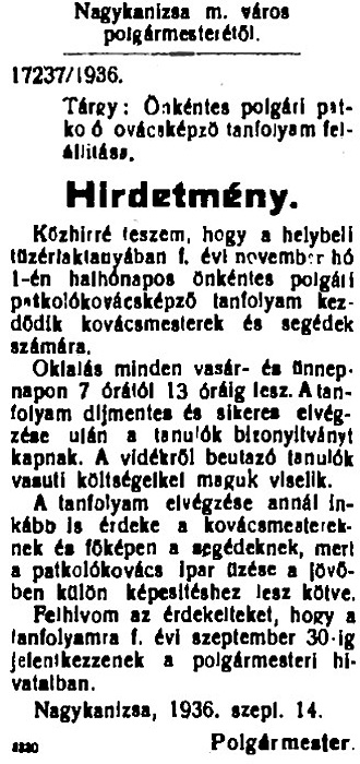 •1936-tól a laktanyában sorozatosan folytak képzések a környék kovácsainak.