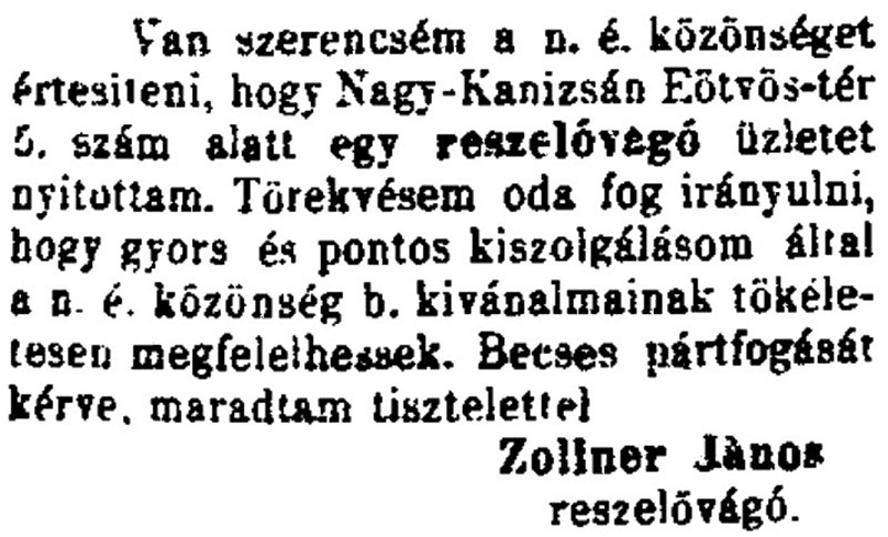 •1892-ben kezdte működését a városban Zollner János reszelővágó. Műhelyét itt, a Hunyadi utca 1. szám alatti házában alakította ki.