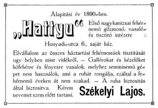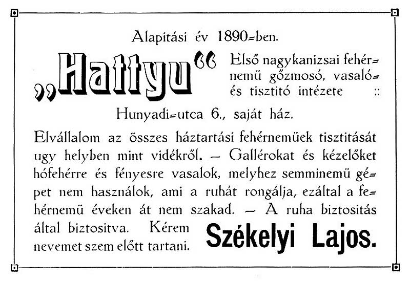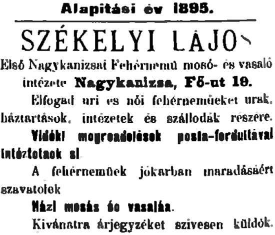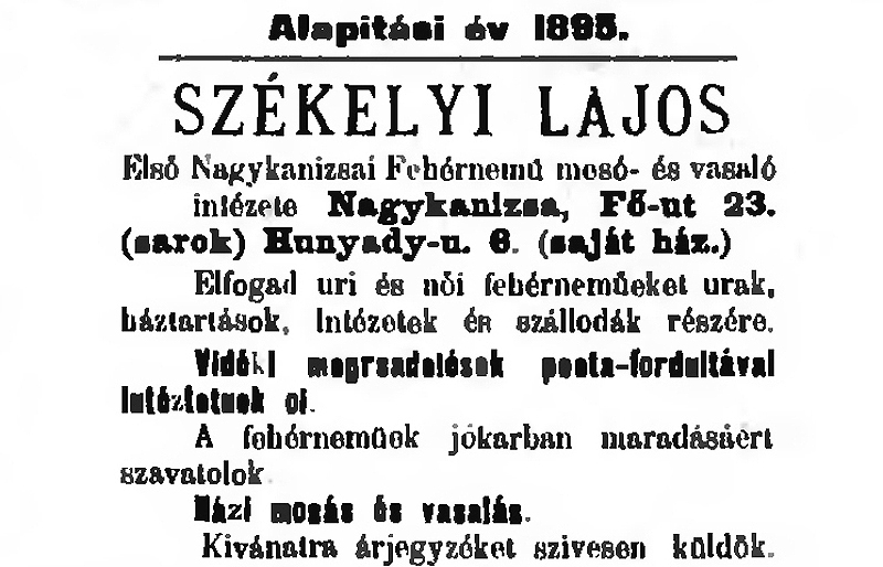 •A század legelején itt, házában működtette Székelyi Lajos Első Nagykanizsai Fehérnemű Mosó és Vasaló Intézetét.