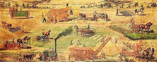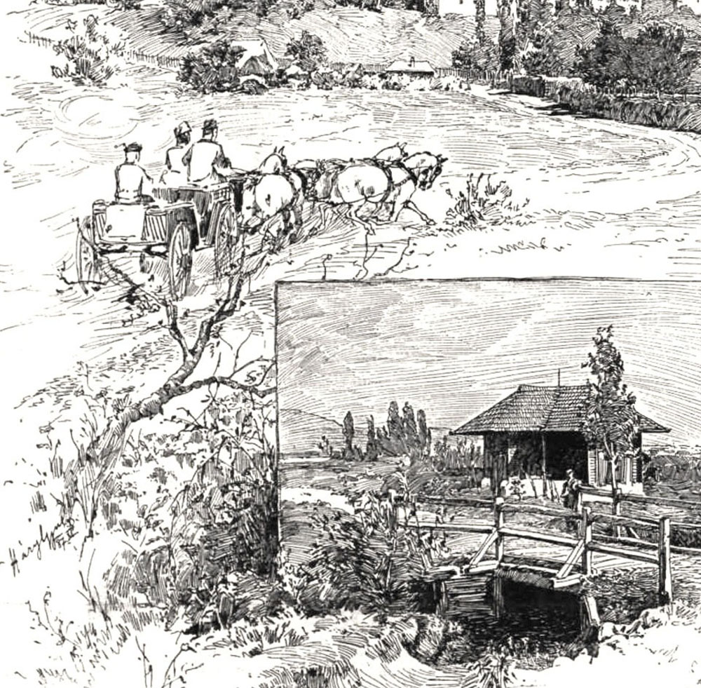 (Balra a major épületei és a téglavető. Középen az uradalmi kocsma és kerthelyisége.)