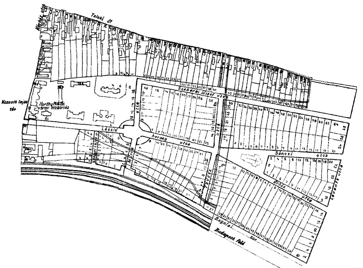 (A térképvázlaton felfedezhető az átalakítást megelőző időszak néhány fontosabb határvonala is. A Mária és a László herceg utca kereszteződésében az ovális terület talán a felszámolt futballpálya emléke.