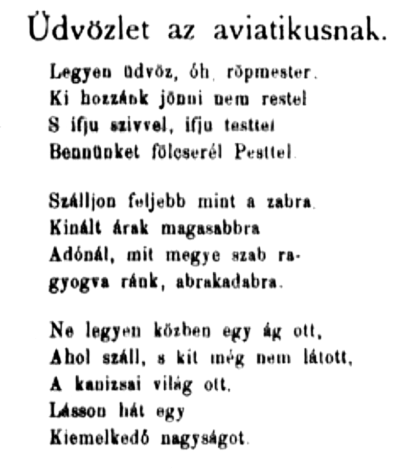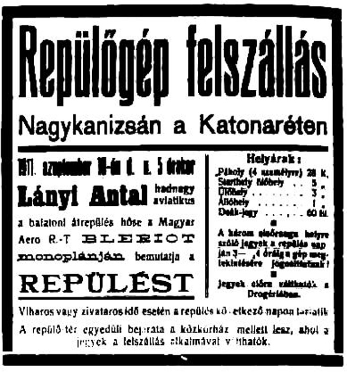 „Midőn gépe egyszer több méter magasságra szökkent, a váratlan sikertől egészen frappírozott aviatikus egy pillanatra elvesztette uralmát a gép felett s ez nekiment egy akácfának.” Így tájékoztatta a kanizsai közönséget a helyi lap, hogy jelezze: megint gépet kell építeni, gyűjtés is újabb indul.