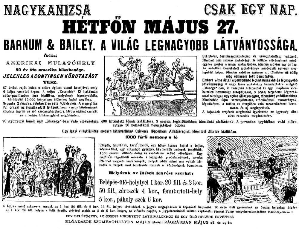 Reggel hétkor állt már a tizenkét sátruk, bennük összesen húszezer ülőhely. A bámészkodók, fizető nézők helybeli seregét három vármegyéből még vagy ötezren egészítették ki. Volt ok bőven a nézelődésre: csak elefántból harmincat láthattak.