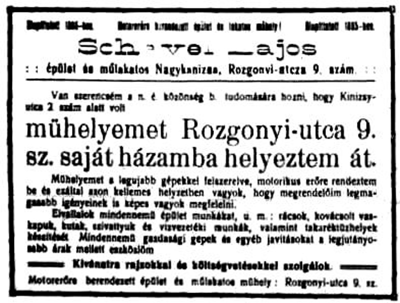 Eredetileg a telek valamelyik épületében volt Schável Lajos lakatos műhelye is.