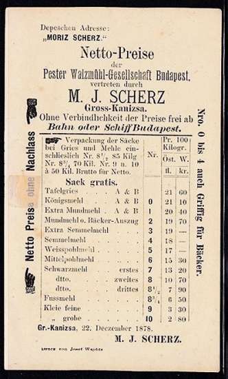 Scherz J. Mór terménykereskedő (Scherz Lipót veje) levelezőlapként küldhető árjegyzéke