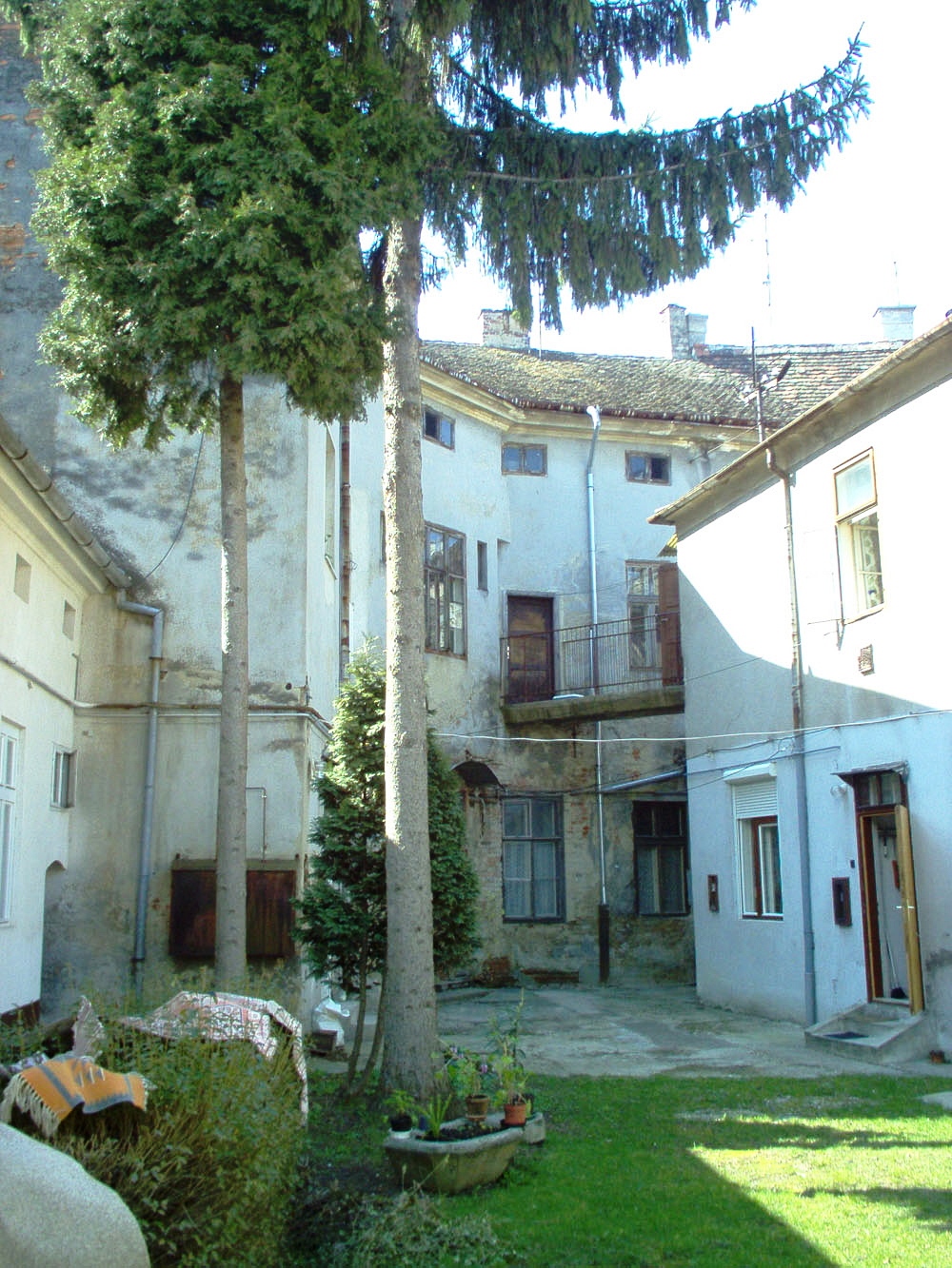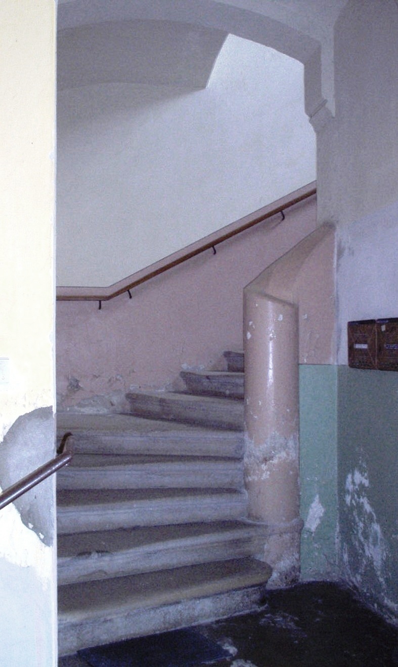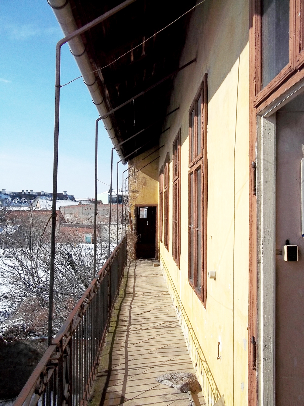(A lépcsőház fából készített lépcsőfokaival, a függőfolyosó, a végén kialakított emeleti „pottyantós” illemhely. Utóbbi a 20. század közepén még általános megoldásnak számított a város emeletes házaiban is. A képen látható lehet fajtája utolsó példánya.)
