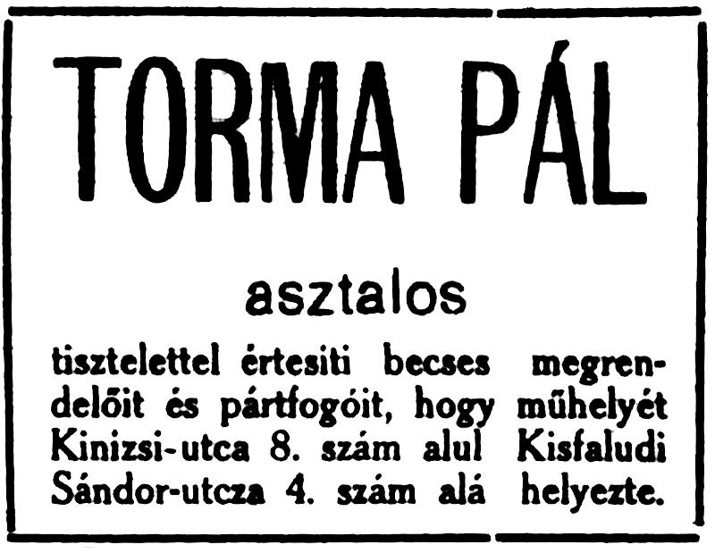 •Tormáék cége 1884-ben jött létre, a két világháború között is létezett az 1883-ban született Torma Pál tulajdonában. Ő 1911-ben kapta meg iparűzési engedélyét. 1913-ban a Kisfaludy utca 4. szám alá, majd újabb és újabb helyekre költöztette műhelyét.