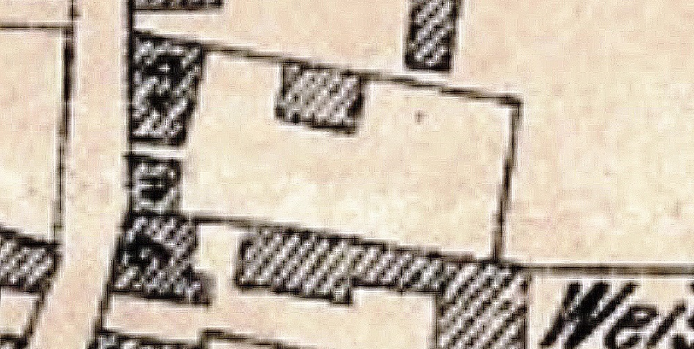 (Balra a 2., jobbra a 9. számú ház egy-egy része. Utóbbi mögött még viszonylag jól látszanak a 11., a 13. és 15. számú épületek.)
