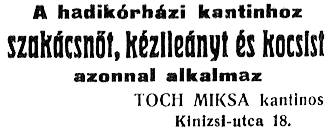 •Mint az alábbi hirdetés illusztrálja, Toch Miksa, a Csengery úti barakkórház kantinosa 1915-ben már a ház lakója volt.