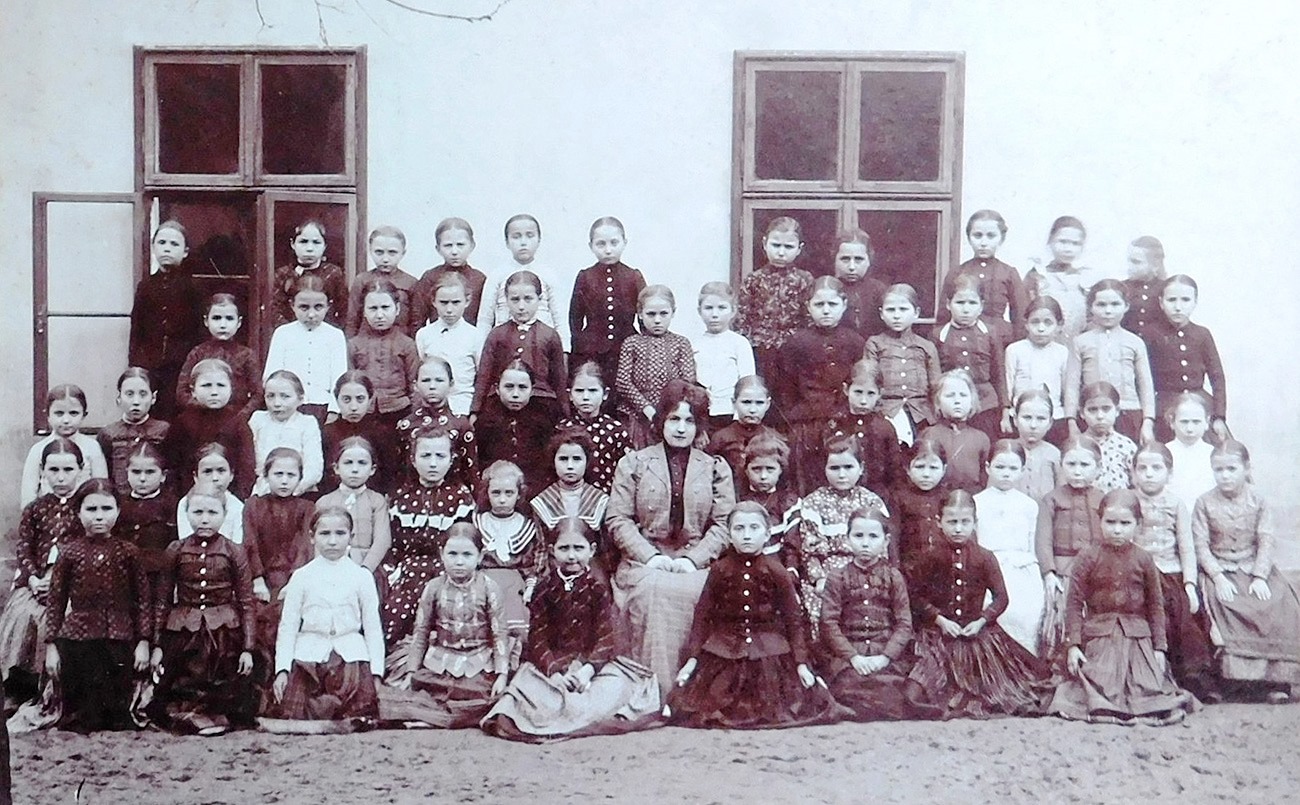 A szigorú tekintetű diákok és tanítónőjük fényképe a 20. század legelső éveinek egyikében készült az intézmény udvarán